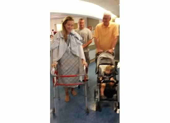Nothing makes you feel completely helpless then recovering from major surgery. I needed assistance going to the bathroom, bathing, moving, walking, eating….you name it. Below is a picture of me, my husband and dad pushing my son in the stroller. Sorry it’s blurry.